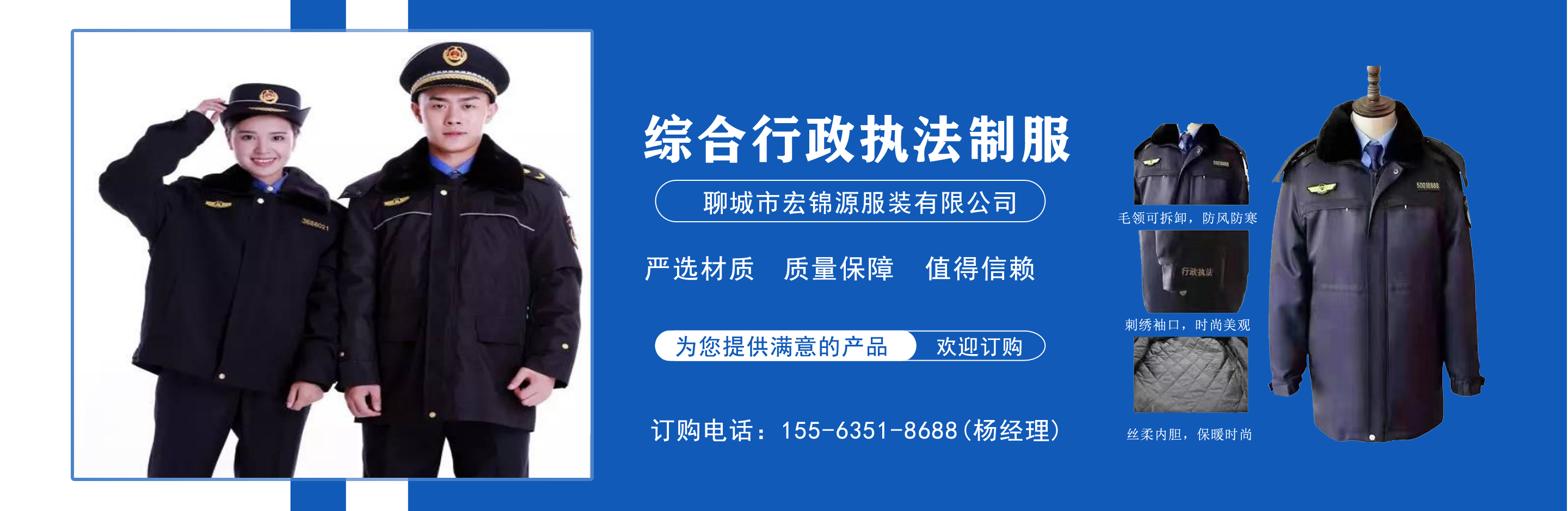 聊城市宏錦源服裝有限公司位于江北水城—山東聊城,地理位置優(yōu)越,交通便利。公司主營綜合行政執(zhí)法制服,交通執(zhí)法服裝,應(yīng)急管理執(zhí)法標(biāo)志服,市場(chǎng)監(jiān)督管理標(biāo)志服,農(nóng)業(yè)執(zhí)法服裝,生態(tài)環(huán)境保護(hù)制服,文化市場(chǎng)執(zhí)法服,城管標(biāo)志服裝廠,衛(wèi)生監(jiān)督制服,六部門標(biāo)志服廠家等,值得信賴! 公司生產(chǎn)的標(biāo)志服裝據(jù)有造型美、板型新、多次水洗不退色、不變型、不起泡?! 罢J(rèn)真辦事,踏實(shí)做人”是宏錦源的企業(yè)精神,我們的宗旨是:“用服務(wù)與真誠來換取你的信任與支持,互惠互利,共創(chuàng)雙贏!”我公司愿與國內(nèi)外各界同仁志士竭誠合作,共創(chuàng)未來企業(yè)目標(biāo):在已選定的服飾領(lǐng)域中,成為行業(yè)的卓越者?! 〗?jīng)營理念:追求產(chǎn)品卓越,為用戶提供完美、高效的服務(wù)。...